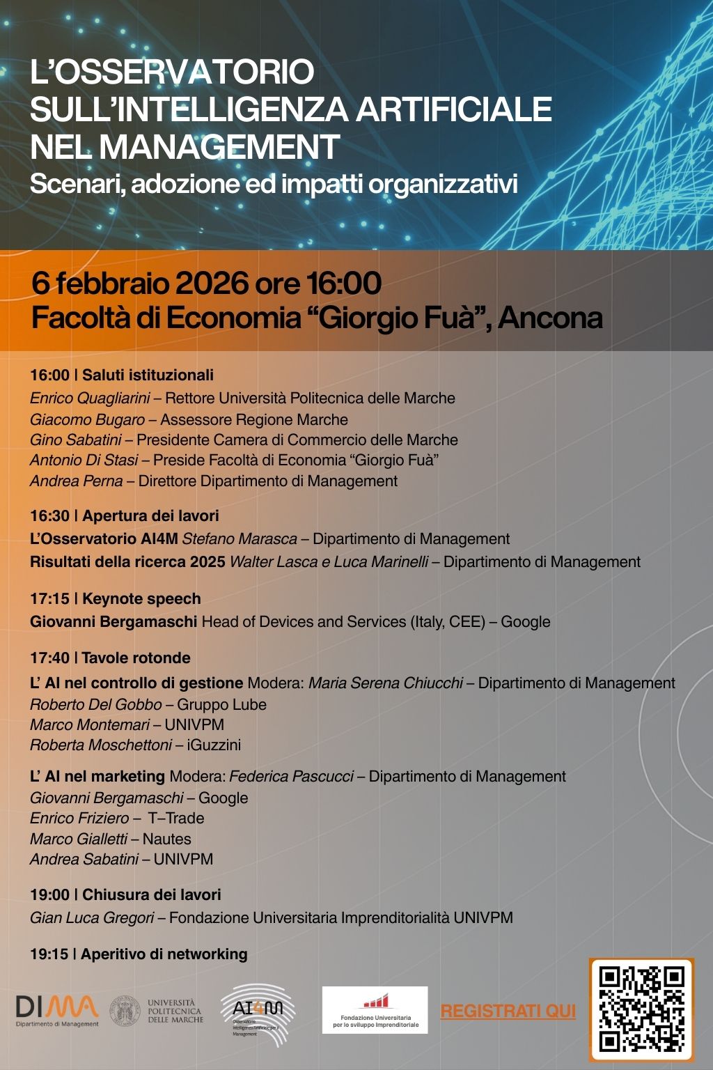 Il 6 febbraio alle ore 16:00, presso la Facoltà di Economia “G. Fuà” di Ancona, si terrà il convegno di presentazione dell’indagine dell’Osservatorio, dedicata all’adozione dell’intelligenza artificiale nelle imprese. Interverranno docenti universitari, manager e rappresentanti di aziende nazionali e internazionali.